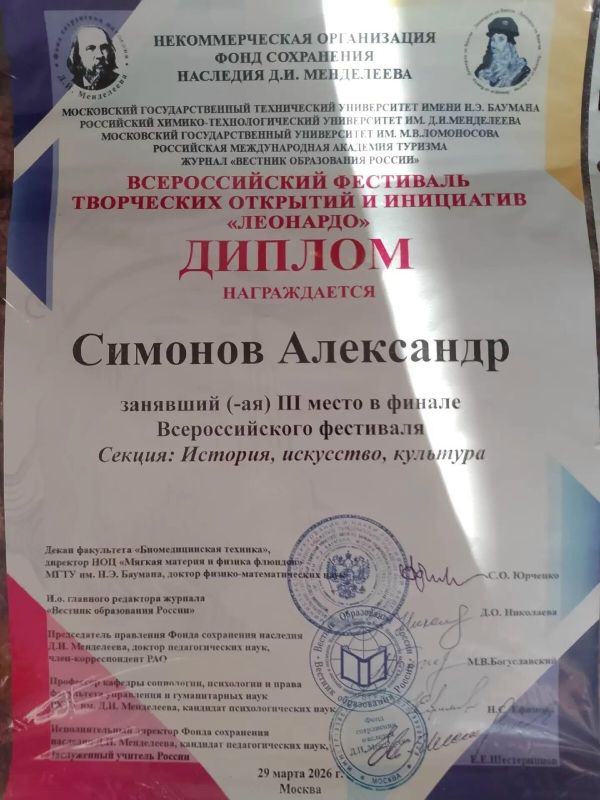 3 место — у Александра Симонова (ЦДО Кольского округа, секция «История, искусство, культура»). Наставник — Георгий Андреевич Дзенисов.